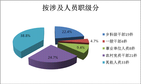 按涉及人员职级分:乡科级干部19件,占22.4%;一般干部4件,占4.7%;事业单位人员8件,占9.4%;农村党员干部21件,占24.7%;其他人员33件,占38.8%。