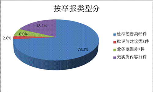 在受理的116件信访举报件中,按举报类型分:检举控告类85件、批评与建议类3件、业务范围外7件、无实质内容21件,分别占73.3%、2.6%、6.0%、18.1%。