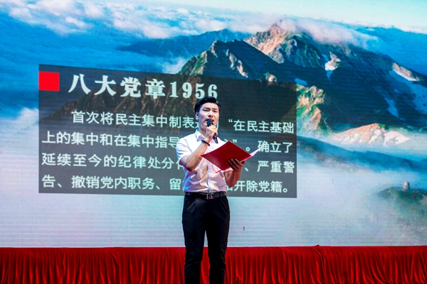 讲述《使命—党章中的纪律沿革》,声情并茂,庄重地带领现场全体党员再学党的一大到十九大的党纪沿革。(滁州市纪委监委)