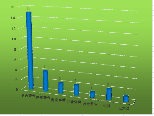 1-6月共结案26件,给予党纪政务处分26人,其中,党纪处分23人:警告15人,严重警告4人,留党察看2人,开除党籍2人;政务处分4人:警告1人,记过2人,记大过1人。