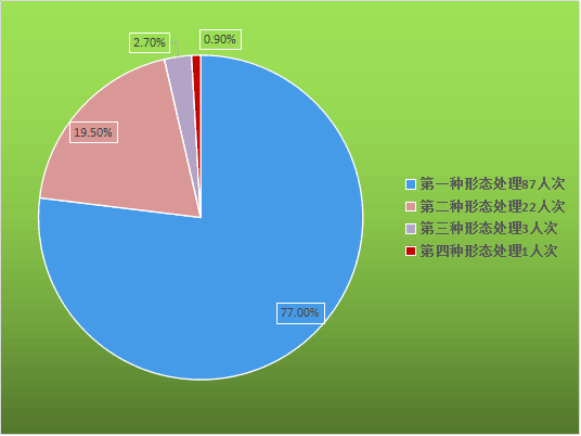 运用监督执纪“四种形态”处理113人次,其中,第一种形态处理87人次,占77.0%;第二种形态处理22人次,占19.5%;第三种形态处理3人次,占2.7%,第四种形态处理1人次,占0.9%。(黄山市纪委监委)