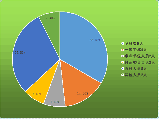 1-6月共立案27件,按照职级划分:乡科级9人,一般干部4人,事业单位人员2人,村两委负责人2人,农村人员8人,其他人员2人。