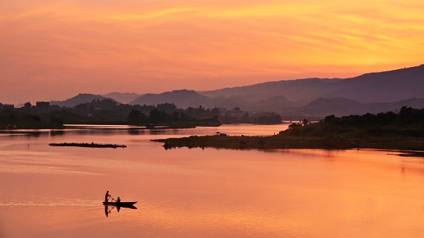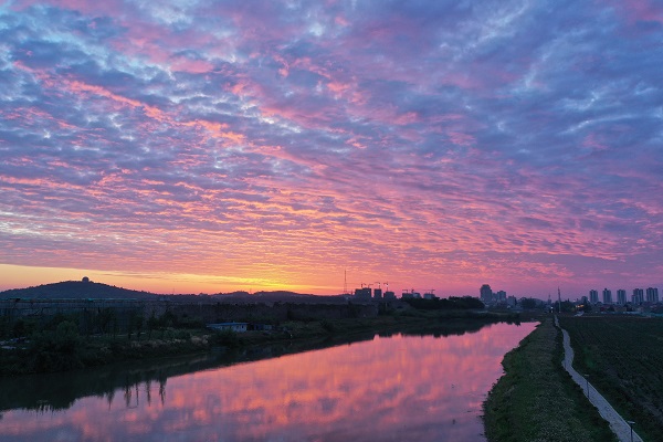 护城河被霞光染上绚丽的颜色(邱传斌 摄)