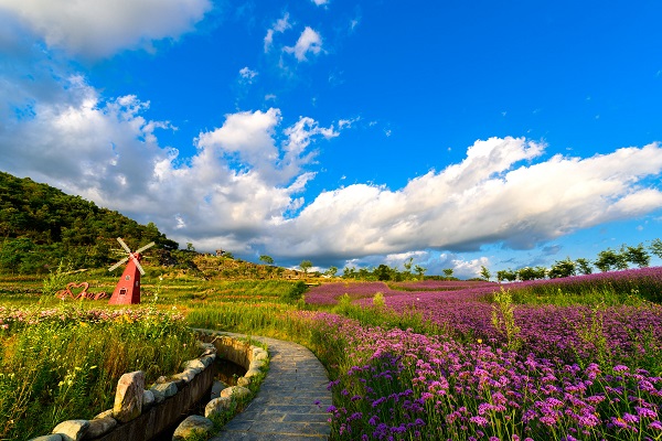 蓝天、白云与盛开着的马鞭草,构成一幅美丽的画卷(崔健 摄)