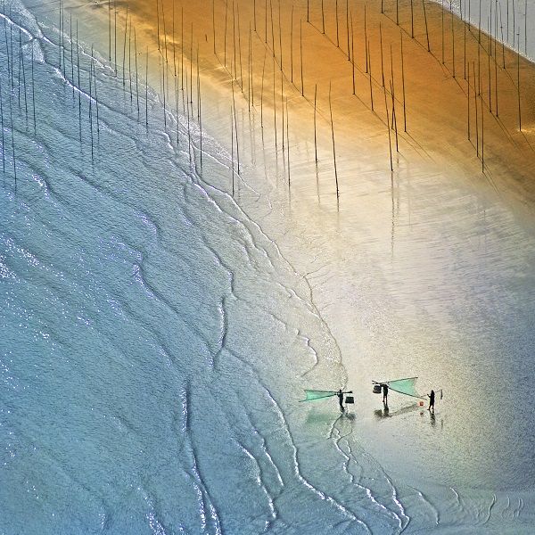 潮水退去,赶海人踏着浪、提着桶,收获大海的馈赠(王丽娜 摄)