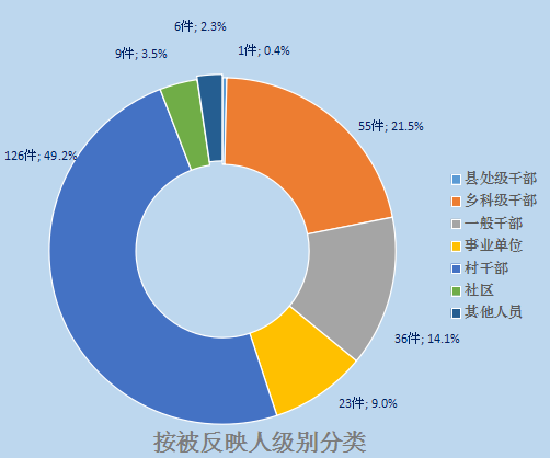 按被反映人级别分类(检举控告):县处级干部1件,乡科级干部55件,一般干部36件,事业单位23件,村干部126件,社区干部9件,其他人员6件。