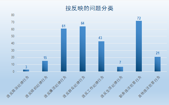 检举控告中按反映的问题分类:违反政治纪律行为3件,违反组织纪律行为15件,违反廉洁纪律行为61件,违反群众纪律行为64件,违反工作纪律行为43件,违反生活纪律行为7件,职务违法犯罪行为72件(其中贪污贿赂行为53件,滥用职权类行为13件,玩忽职守类行为3件,徇私舞弊类行为1件,行使公权力过程中发生的其他违法犯罪行为5件),其他违法犯罪行为21件。