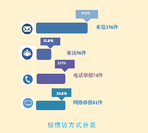 按信访方式分类:来信136件、来访36件、电话举报74件、网络举报81件。