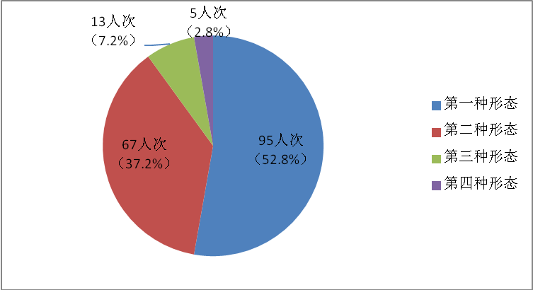 运用监督执纪“四种形态”处理180人次,其中第一种形态95人次,占比52.8%;第二种形态67人次,占比37.2%;第三种形态13人次,占比7.2%;第四种形态5人次,占比2.8%。