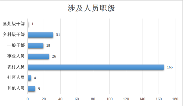 按检举控告对象分类:县处级干部1件,占比0.4%;乡科级干部31件,占比12.1%;一般干部19件,占比7.4%;事业人员26件,占比10.2%;农村人员166件,占比64.8%;社区人员4件,占比1.6%;其他人员9件,占比3.5%。