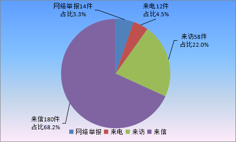 按信访方式分类:来信180件,来访58件,来电12件,网络举报14件,分别占68.2%、22.0%、4.5%、5.3%。