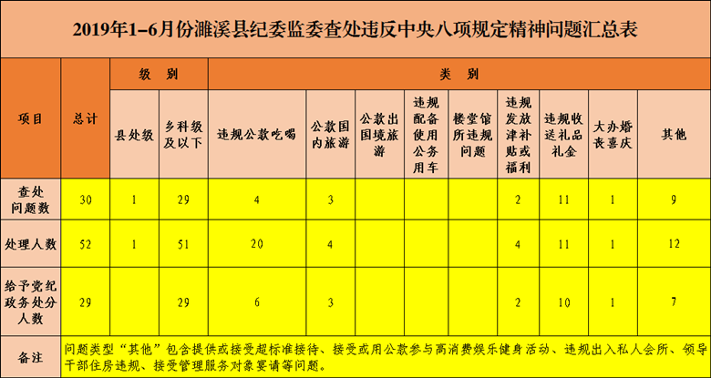 1-6月,共查处违反中央八项规定精神问题30起, 其中,违规公款吃喝4起,占13.33%;公款国内旅游3起,占比10%;违规发放津补贴或福利2起,占6.67%;违规收送礼品礼金11起,占36.67%;大办婚丧喜庆1起,占3.33%;其他问题9起,占30%。 处理52人,给予党纪政务处分29人,其中,县处级1起、处理1人,乡科级及以下29起、处理51人,点名道姓通报曝光4期22人。