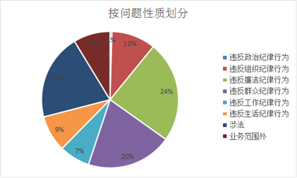 按问题性质划分:违反政治纪律问题1件,违反组织纪律问题29件,违反廉洁纪律问题66件,违反群众纪律问题56件,违反工作纪律问题20件,违反生活纪律问题24件,涉法类问题56件,业务外问题24件。