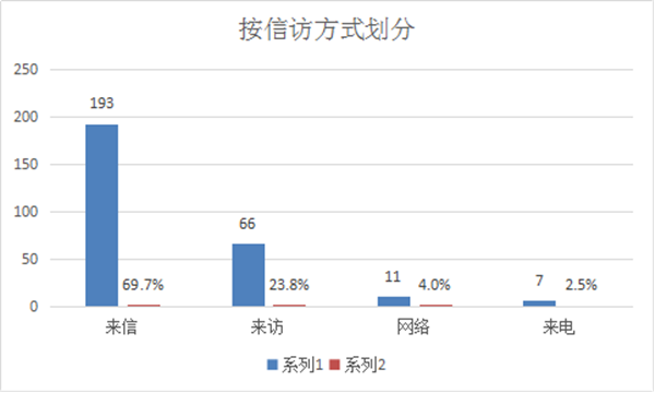 按信访方式划分:来信193件,占69.7%;来访66件,占23.8%;网络举报11件,占4%;来电7件,占2.5%。