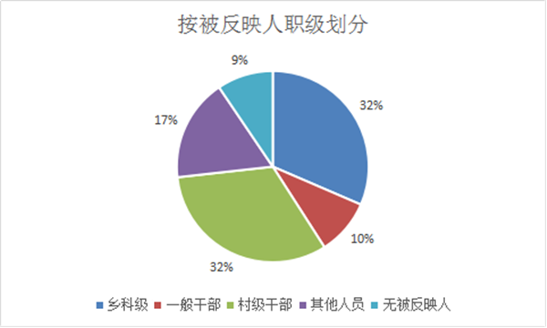 按被反映人职级划分:乡科级72件,一般干部22件,村级党员干部127件,其他人员37件,无被反映人19件。(宿州市纪委监委)
