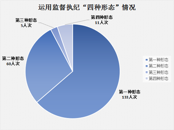 1-6月,全县各级纪检监察机关共运用监督执纪“四种形态”处理209人次。其中,第一种形态133人次,占比63.6%;第二种形态60人次,占比28.7%;第三种形态5人次,占比2.4%;第四种形态11人次,占比5.3%。 (宣城市纪委监委)