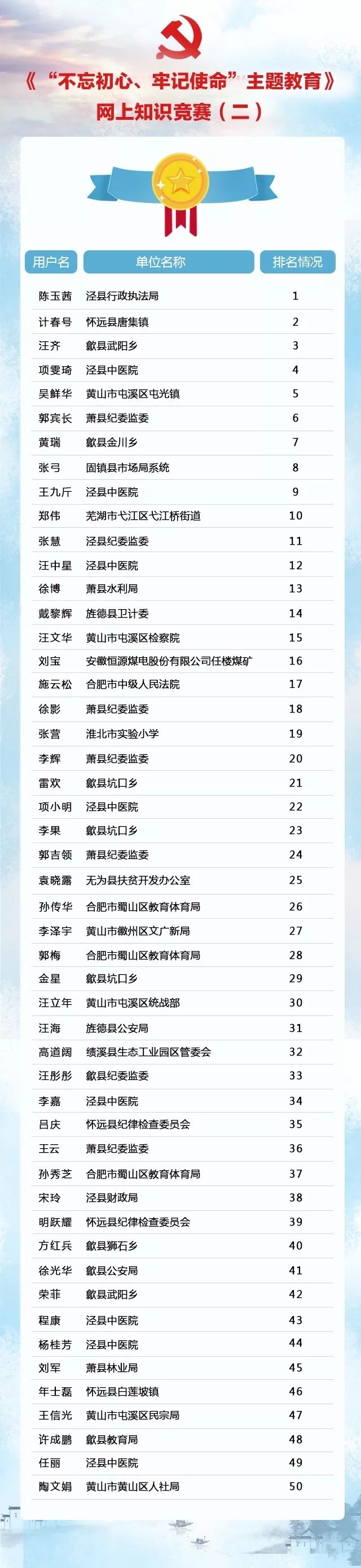上一期共有6.2万人次参与答题,合格率达98%以上。下列同志位列前50名,荣获“半月一赛”第9期“党纪法规知识在线学习之星”!