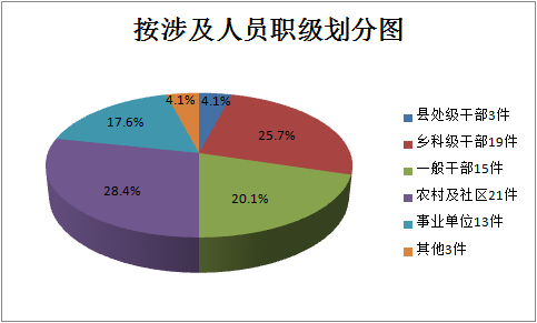 在直接受理的74件检举控告类信访举报件中,按涉及人员职级分:县处级干部3件,占比4.1%;乡科级干部19件,占比25.7%;一般干部15件,占比20.1%;农村及社区人员21件,占比28.4%;事业单位人员13件,占比17.6% ;其他人员3件,占比4.1%。 (宣城市纪委监委)