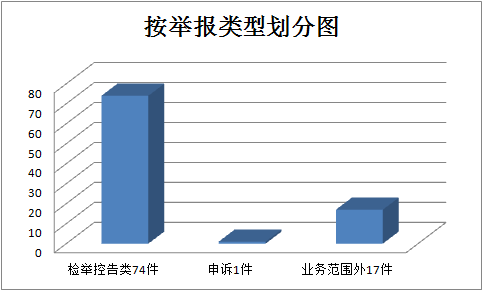在直接受理的92件信访举报件中,按举报类型分:检举控告类74件,申诉1件,业务范围外17件,分别占比80.4%、1.1%、18.5%;实名举报48件,匿名举报44件,分别占比52.2%、47.8%。
