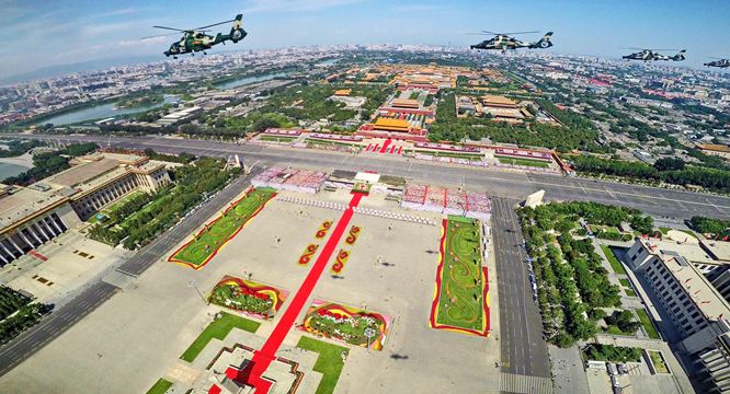 2015年9月3日,中国人民抗日战争暨世界反法西斯战争胜利70周年纪念大会在北京隆重举行。这是航拍的直升机梯队飞过天安门广场。(资料图片)