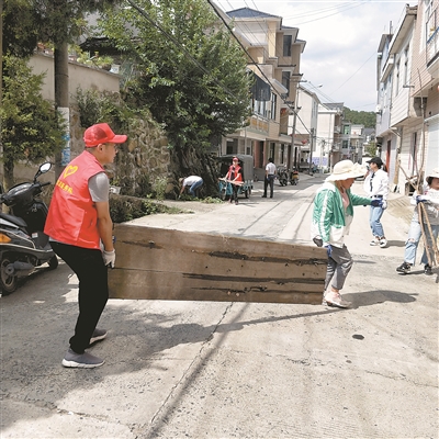 图为李夏(左)在方家湾村走访群众时,帮助村民整治卫生环境。胡芳斌 摄