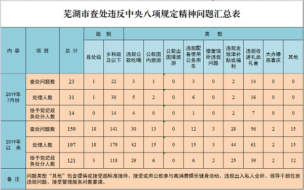 2019年以来,芜湖市持之以恒贯彻落实中央八项规定精神,坚定不移保持整治“四风”顽疾一寸不让高压态势。全市各级纪检监察机关切实履行监督执纪问责职责,今年1-7月,共查处违反中央八项规定精神问题159起,处理197人,给予党纪政务处分121人。
