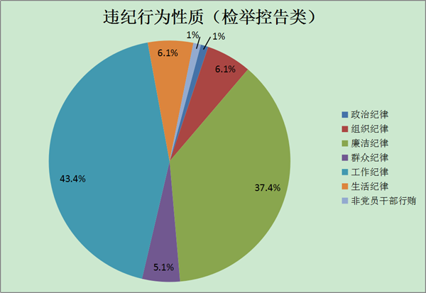 在99件检举控告类信访举报中,按违纪行为性质分:违反政治纪律1件,占1%;违反组织纪律6件,占6.1%;违反廉洁纪律37件,占37.4%;违反群众纪律5件,占5.1%;违反工作纪律43件,占43.4%;违反生活纪律6件,占6.1%;反映非党员干部行贿1件,占1%。