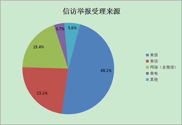 在市本级受理的108件信访举报中,按信访举报受理来源分:来信52件、来访25件、网络举报(含微信)21件、来电4件、其他来源6件,分别占48.1%、23.1%、19.4%、3.7%、5.6%。