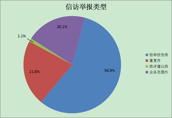 在全市受理的174件信访举报件中,按信访举报类型分:检举控告类99件,占56.9%;重复件38件,占21.8%;批评建议类2件,占1.1%;业务范围外35件,占20.1%。