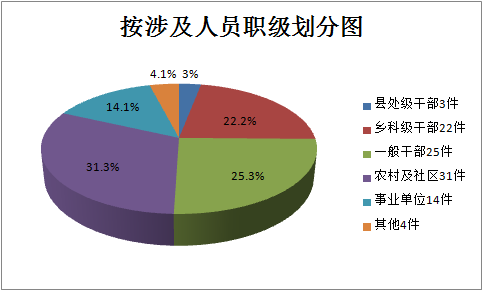 在直接受理的99件检举控告类信访举报件中,按涉及人员职级分:县处级干部3件,占比3%;乡科级干部22件,占比22.2%;一般干部25件,占比25.3%;农村及社区31件,占比31.3%;事业单位14件,占比14.1% ;其他4件,占比4.1%。(宣城市纪委监委)