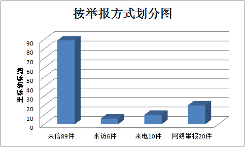 在直接受理的125件信访举报件中,按举报方式分:来信89件,来访6件,来电10件,网络举报20件,分别占比71.2%、4.8%、8%、16%。