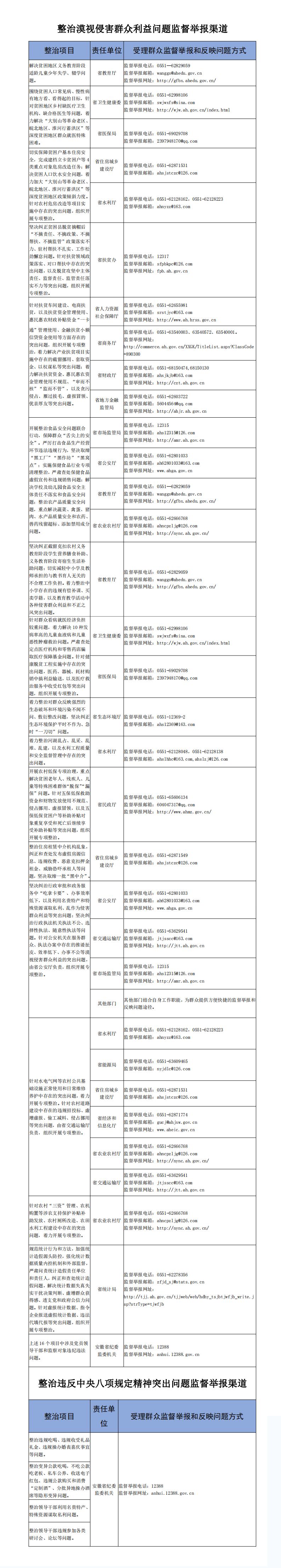 按照省委“不忘初心、牢记使命”主题教育专项整治工作要求,省纪委监委机关牵头开展漠视侵害群众利益问题专项整治工作,围绕聚焦扶贫领域腐败和作风问题,聚焦教育医疗、环境保护、食品药品安全等民生领域侵害群众利益问题,聚焦发生在群众身边的不正之风和“微腐败”问题,聚焦统计造假问题,着力解决群众最关心最直接最现实的利益问题。同时,对违反中央八项规定精神的突出问题开展专项整治。为方便群众参与监督和反映问题,做好开门抓整治工作,现将专项整治受理群众监督举报和反映问题方式公布如下。