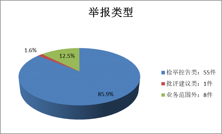 在直接受理的64件信访举报件中,按举报类型分:检举控告类55件,占比85.9%;批评建议类1件,占比1.6%;业务范围外8件,占比12.5%。