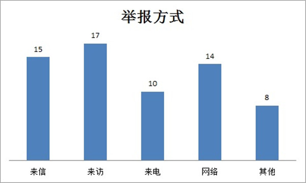 在直接受理的64件信访举报件中,按举报方式分:来信15件,占比23.4%;来访17件,占比26.6%;来电10件,占比15.6%;网络举报14件,占比21.9%;其他8件,占比12.5%。