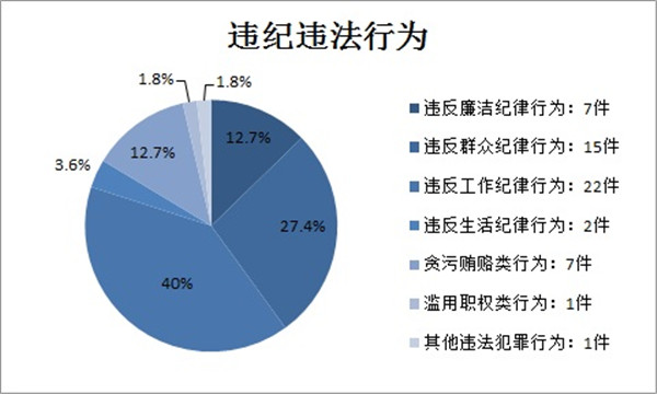在55件检举控告类信访举报件中,按违纪违法行为类型分:违反廉洁纪律行为7件,占12.7%;违反群众纪律行为15件,占27.4%;违反工作纪律行为22件,占40%;违反生活纪律行为2件,占3.6%;贪污贿赂类行为7件,占12.7%;滥用职权类行为1件,占1.8%;其他违法犯罪行为1件,占1.8%。