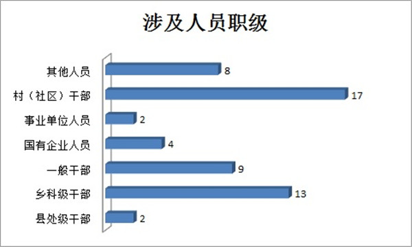 在55件检举控告类信访举报件中,按涉及人员职级分:县处级干部2件,占3.6%;乡科级干部13件,占23.6%;一般干部9件,占16.4%。在其他人员中,国有企业人员4人,占7.3%;事业单位人员2人,占3.6%;村(社区)干部17件,占30.9%;其他人员8件,占14.6%。