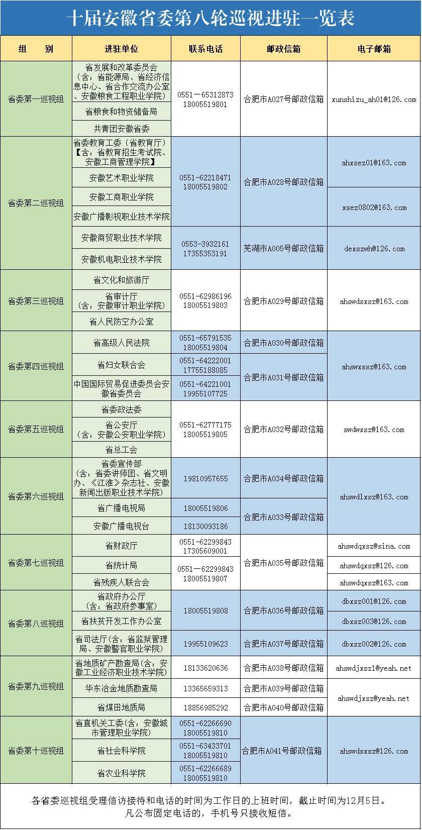 根据安徽省委统一部署,十届安徽省委第八轮巡视正式启动。本轮巡视共派出10个巡视组190名巡视干部,对28个省直单位及其所属的副厅级二级机构和高职高专开展巡视,时间为3个月,12月上旬驻点巡视结束。目前,各巡视组已全部进驻开展巡视,并公布了联系方式。