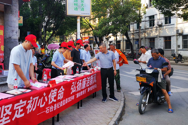 近日,作为廉政教育进万家活动的一个主场,石台县纪委监委在县城人口集中的广场开展“坚定初心使命,弘扬廉洁新风”为主题的“廉政教育月”集中宣传活动。现场大喇叭宣讲廉政专题教育4个多小时,纪检干部主动为干部群众讲解《监察法》、扫黑除恶基础知识、县纪委监委信访举报知识等200余人次,发放《图解违反中央八项规定精神问题规定》《“廉洁同行清正为伴”家庭助廉倡议书》等1000余份。