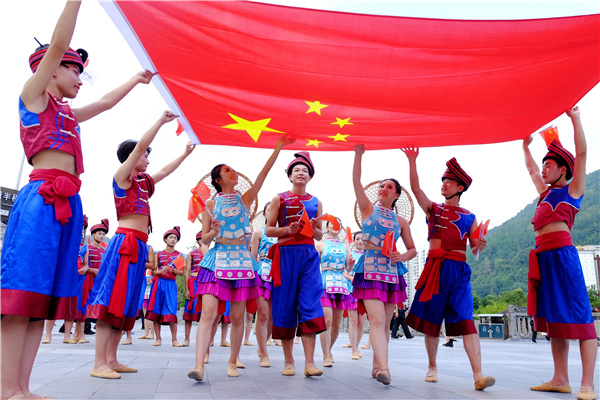 重庆市酉阳土家族苗族自治县土家族、苗族的青年男女们,身着民族服装来到桃花源广场和国旗合影,用这种方式为祖国送上自己的祝福。(重庆市酉阳自治县纪委监委供 杨春来 摄)