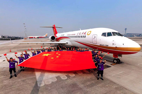 国庆前夕,在成都双流国际机场停机坪上,成都航空的地勤人员在一架崭新的国产ARJ21民航飞机前与国旗合影,共同祝福伟大祖国生日快乐!(成都市双流区纪委监委供 陈松涛 摄)