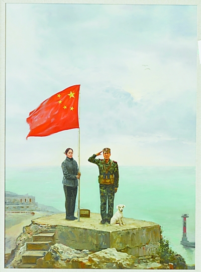 国旗是国家主权的象征。陆地边关,海上边防线,祖国领空……国旗高扬,便宣示着中华人民共和国主权的确立和不容侵犯。在柯如山的油画《雪域巡疆图》中,战士们顶风冒雪跋涉在空气稀薄的青藏雪原,一面鲜艳的五星红旗在茫茫雪山间格外醒目,这一抹鲜红,是整个画面的“画眼”,使得画面色彩对比强烈,把高原战士们不畏艰险守卫祖国边疆的精神无声地传达出来。牟达器、付巍巍、张贯一创作的油画《边境线上活界碑——魏德友》,表现了新疆生产建设兵团退休职工魏德友五十多年如一日扎根艰苦偏远地区巡边护边的感人形象,迎风招展的五星红旗如天边的红霞,照亮了祖国的边疆。在米巧铭根据王继才和王仕花夫妇坚守开山岛、守卫祖国海防线的感人事迹而创作的油画作品《孤岛卫士》中,王仕花手握旗杆,王继才正在向国旗敬礼,海天寂静,五星红旗映照着主人公伟大的心灵,灼灼闪耀。