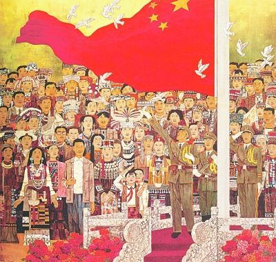高亢嘹亮的国歌响起,鲜艳的五星红旗迎风飘扬。无论是在奥运健儿夺冠的颁奖典礼上,还是在青春飞扬的校园升旗仪式上,我们常常能看到这样激动人心的一幕。国旗,是国家的象征,是民族精神的图腾,她飘扬在新中国成立以来许许多多重要的瞬间,飘扬在每个中华儿女的心头。在描绘新中国发展新貌、人民生活图景的丹青佳作中,也经常能看到那方红艳艳的国旗,她点亮了画面,也引燃人们充盈于心的激情。