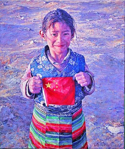 国旗是中华儿女心灵的纽带。在表现和平解放西藏主题的作品,如韩书力的《高原祥云·和平解放西藏》、赵友萍的《百万农奴站起来》中,在描绘香港、澳门回归祖国,如廖宗怡、张树军的《1997·香港防务交接》,罗田喜的《使命—欢送驻港部队》,徐里、谭乃麟的《不忘初心,坚持“一国两制”,香港的未来一定更美好》,邢俊勤等的《澳门回归》中,在表现中华儿女一家亲,如李绍忠的《两岸同胞兄弟情》、王其钧的《身远心近》等画作中,五星红旗或在旗杆上高高飘扬,或在人们手中轻轻挥舞。一面国旗,牵动着炎黄子孙对祖国的爱与深情,当“我和我的祖国”歌声响起,当国旗在蓝天白云下舞动,祖国就在身边,那样生动,那样亲切。