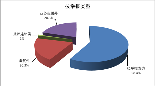 在全市受理的207件信访举报件中,按举报类型分为:检举控告类121件,占58.4%;重复件42件,占20.3%;批评建议类2件,占1%;业务范围外42件,占20.3%。