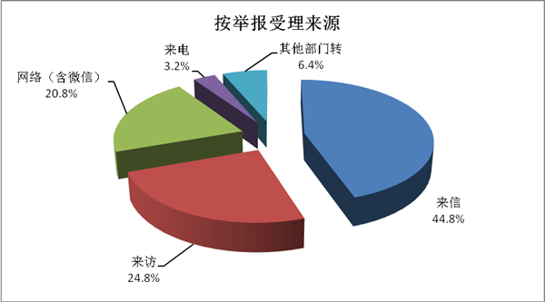 1-9月,全市共受理信访举报207件,其中本级受理125件,占60.4%;上级转办82件,占39.6%。本级受理的125件信访举报件按来源分为:来信56件、来访31件、网络举报(含微信)26件、来电4件、其他来源8件,分别占44.8%、24.8%、20.8%、3.2%、6.4%。