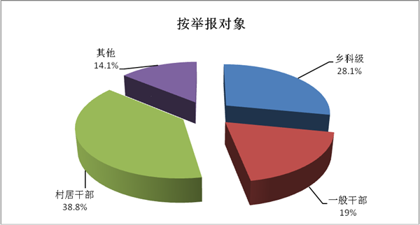 在受理的121件检举控告类信访举报件中,按举报对象类别分为:乡科级干部34件,一般干部23件,村居干部47件,其他人员17件,分别占28.1%、19%、38.8%、14.1%。(宣城市纪委监委)