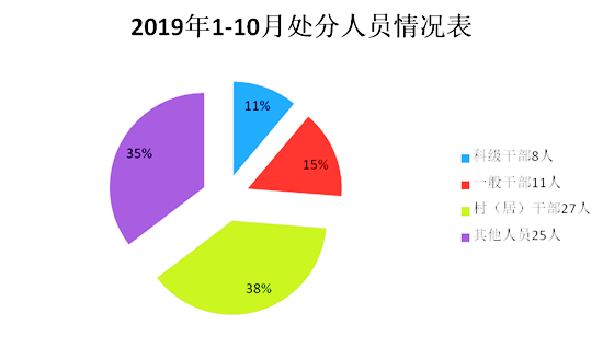从给予党纪政务处分人员的职级来看:涉及科级干部8人,占比11.3%;一般干部11人,占比15.5%;村(居)干部27人,占比38%;其他人员25人,占比35.2%。
