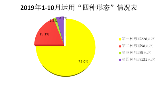 1-10月,全县纪检监察机关共运用监督执纪“四种形态”处理304人次。其中,第一种形态228人次,占75%;第二种形态58人次,占19.1%;第三种形态5人次,占1.6%;第四种形态13人次,占4.3%。(芜湖市纪委监委)