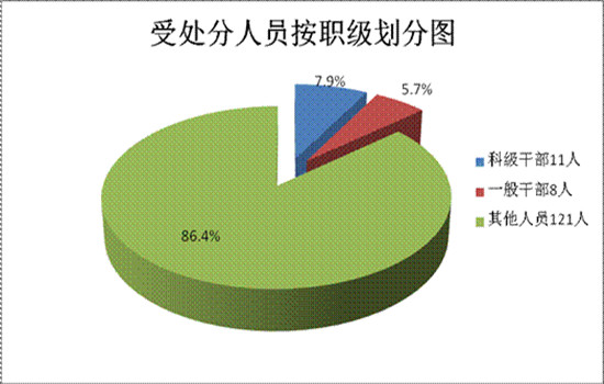 在给予党纪政务处分的140人中,涉及科级干部11人,占比7.9%;一般干部8人,占比5.7%;其他人员121人,占比86.4%。