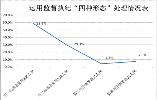 1-10月,全区纪检监察组织共运用监督执纪“四种形态”处理348人次。其中,第一种形态205人次,占总处理人数的58.9%;第二种形态102人次,占总处理人数的29.3%;第三种形态15人次,占总处理人数的4.3%;第四种形态26人次,占总处理人数的7.5%。